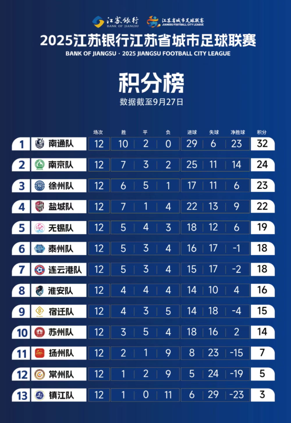 徐州队本轮被逼平,他们被南京队超越,最终排名第三。盐城队2比0击败扬州队后,排在第四位。另外一场比赛,苏州队主场与常州队奉献一场进球大战,最终苏州队3比2绝杀对手,排名第十,扬州、常州和镇江队分列11至13位。